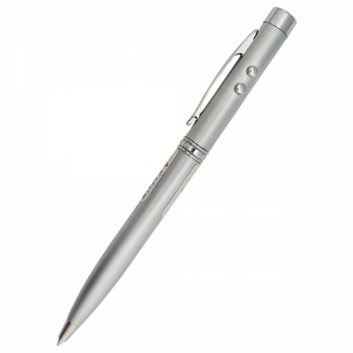 Caneta metal com laser e lanterna, possui desenhos indicativos ao lado dos botões. Para acionar a esferográfica basta girar o corpo da caneta. Acompanha três baterias LR41.