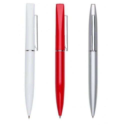 Caneta semi-metal de corpo colorido com clip metálico e anel central prata. Aciona por giro.