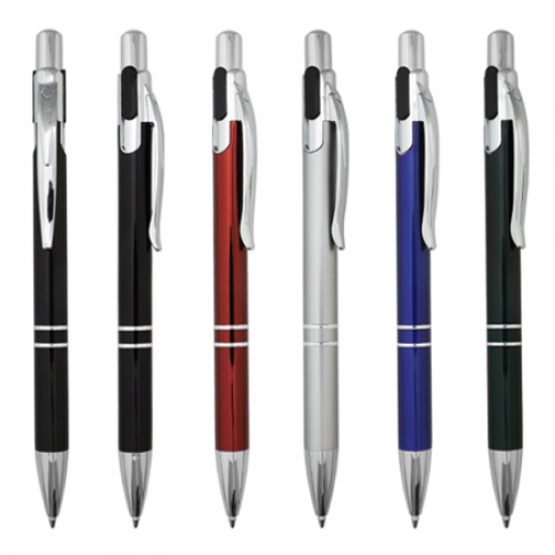 Caneta metal colorida com detalhes prata. Clip metálico prata com detalhes em relevo, tem a lateral com detalhe plástico preto. Possui dois anéis prata na parte inferior. Aciona por clique.