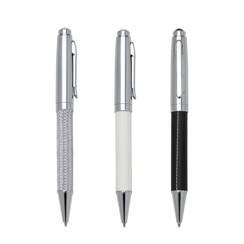 Caneta metal prata com 3 versões. Clip metal e ponta superior colorida, tem as versões couro branco, couro preto, e prata texturizado. Aciona por giro.