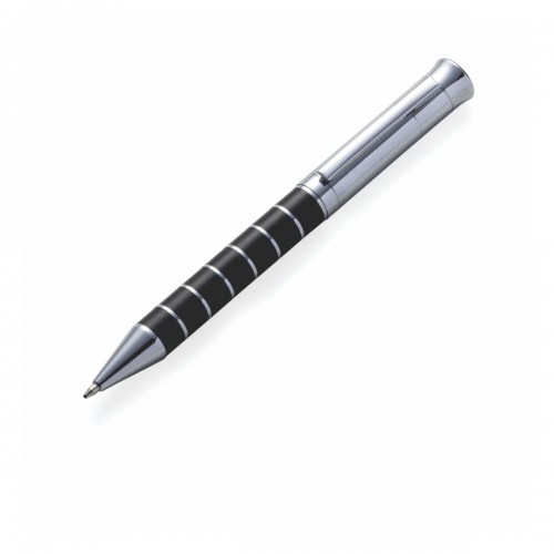 Caneta metal prata brilhante com detalhes preto. Possui seis anéis prateados, aciona por giro.