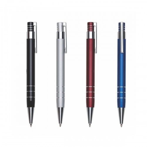 Caneta metal fosca inteira colorida com detalhes prata. Clip metal e com três anéis na parte superior e outros três na parte inferior. Aciona por clique.
