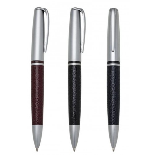 Caneta metal prata com detalhe em couro. Clip metal com a ponta colorida, possui anel central preto e dois anéis em relevo na ponteira. Possui as versões fosca e brilhante, aciona por giro.