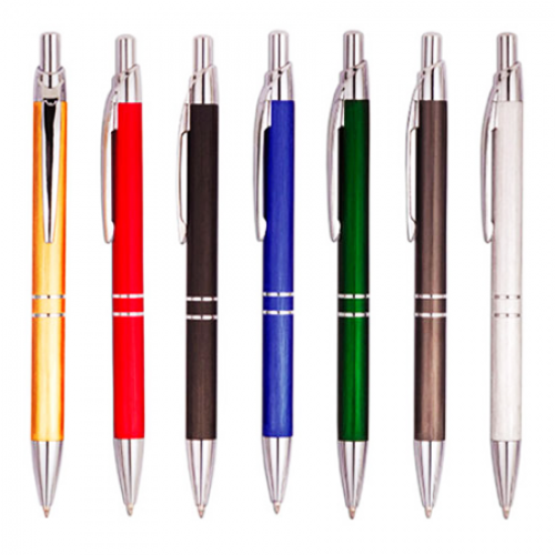 Caneta metal inteira colorida(pintura metalizada) com detalhes em prata, design executivo. Anel plás..