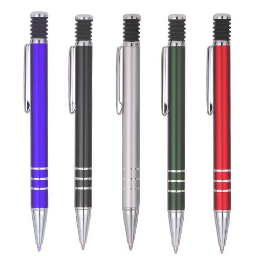 Caneta metal inteira colorida com detalhes prata. Clip metal e mola/sanfona preta no acionador, possui três anéis prata na parte inferior. Aciona por clique.