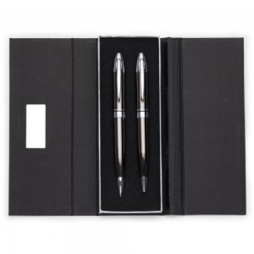 Conjunto caneta e lapiseira em estojo de cartonagem com placa central para personalização. Clip metal e anel central possui: anel fino prata, anel preto fino e um anel maior prata com relevo e acionam por giro. Estojo revestida com espuma na parte interna.
