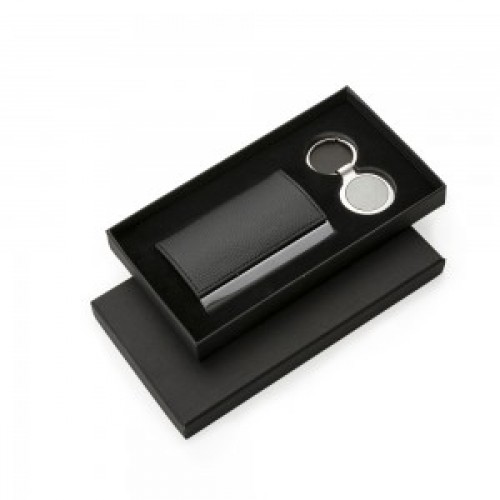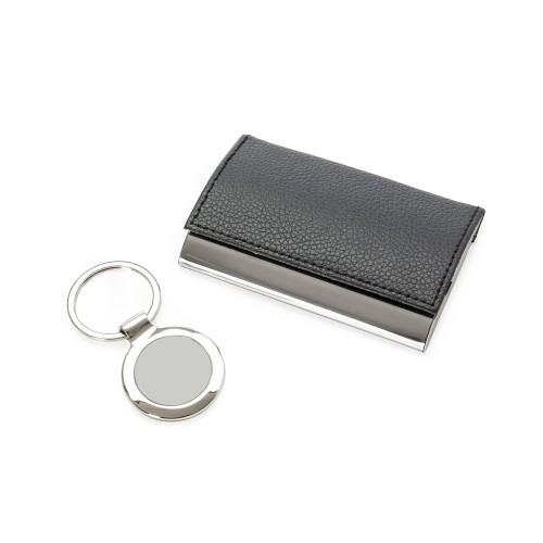 Kit porta cartão e chaveiro metal. Embalagem de papelão com parte interna de veludo, porta cartão em couro sintético com detalhe em metal e parte interna em veludo. Chaveiro redondo de metal com chapa fumê(verso liso).