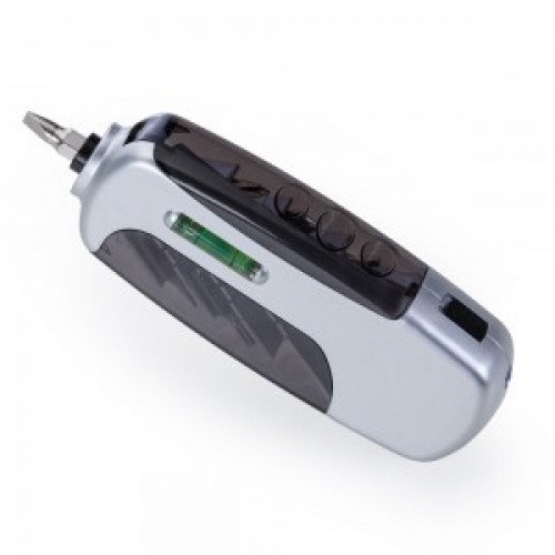 Kit ferramenta multifunções. Corpo prata com detalhes coloridos, abre pelas laterais e possui suporte superior para encaixar as pontas de cada chave. Possui 3 pontas de chaves Philips, 3 pontas de chave de fenda, nível, lanterna com botão para ligar/desligar e trena de 1 metro . Acompanha 3 baterias LR41.